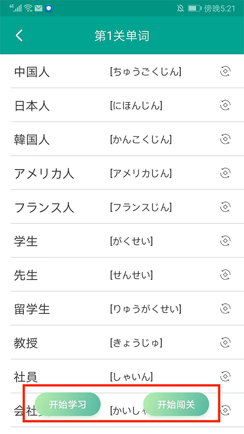 3、返回应用首页,包括开始学习和单词闯关栏目,选择【开始学习】选项,包括标准日语初级、中级和高级课本以及高中日语课本可以选择学习。