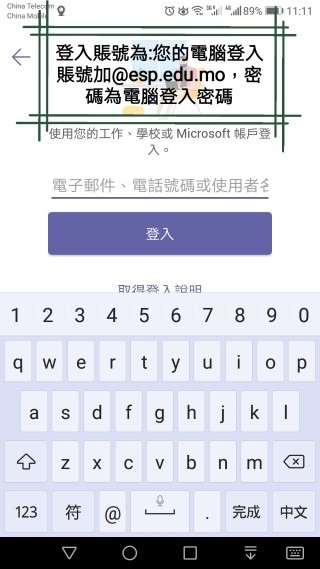用户名为您的电脑登入账号加@esp.edu.mo,单击「登入」,密码与您的电脑登入密码相同,如下图所示: