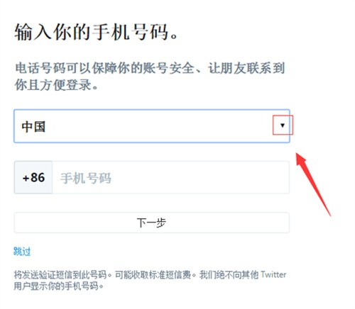 3、页面跳转,旁边的倒三角符号可以选择地区,输入号码点击下一步。