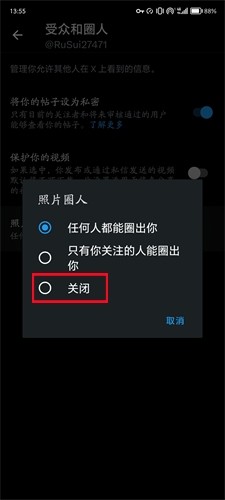 6、在弹出的小框中勾选“关闭”这样别人就不会@你在推文上了。