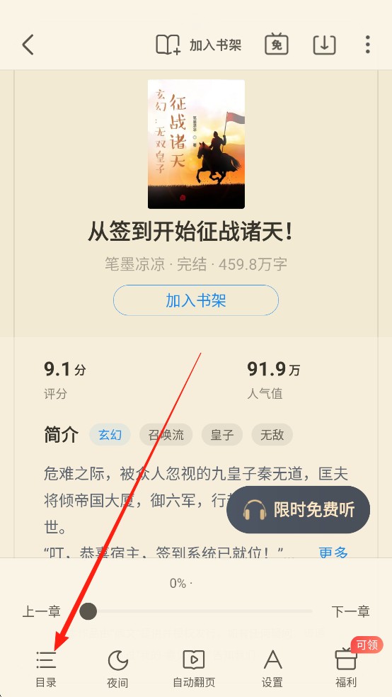 2、然后点击【目录】选择章节开始阅读