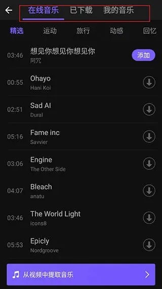 4、点击音乐,支持添加在线音乐、已下载、我的音乐库,下载自己喜欢的音乐,点击添加即可;