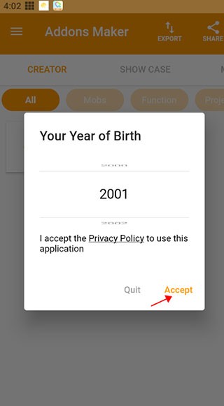 1、在本站下载安装我的世界mod编辑器app,打开app,选择你的生日并点击接受。