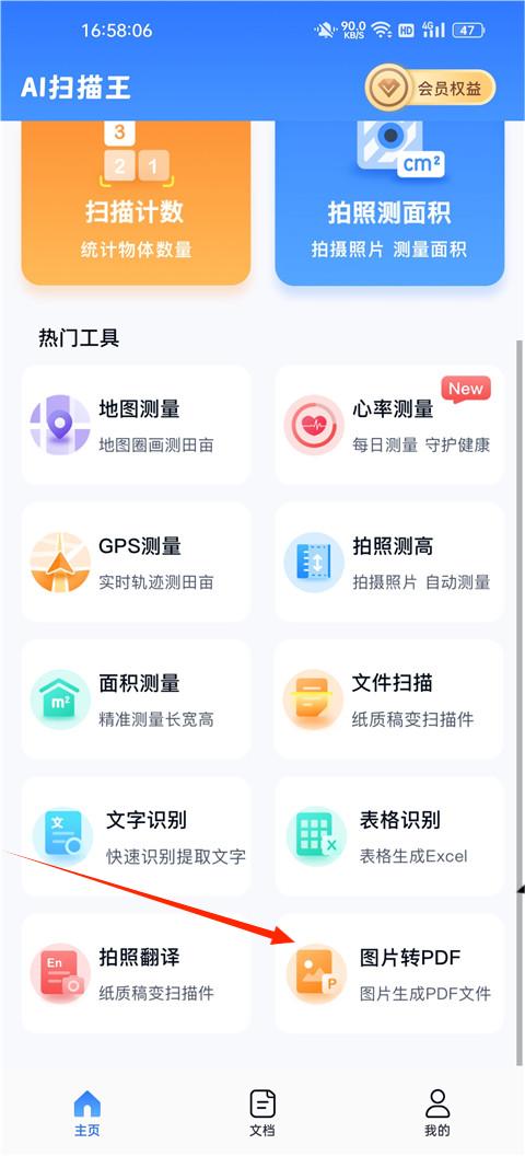 1、在本站下载安装AI扫描王app,打开app首页拥有众多的功能,像地图测量、测试高度、测量面积、图片转pdf等