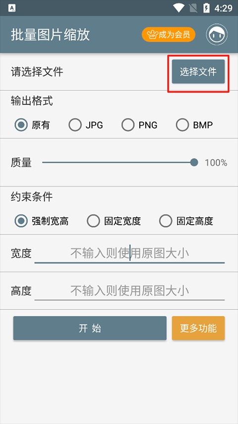 1、在本站下载安装批量图片缩放app,打开软件点击【选择文件】