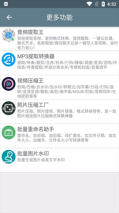 5、除此之外,点击更多功能软件内还有【音频提取、视频压缩、批量图片水印等功能】