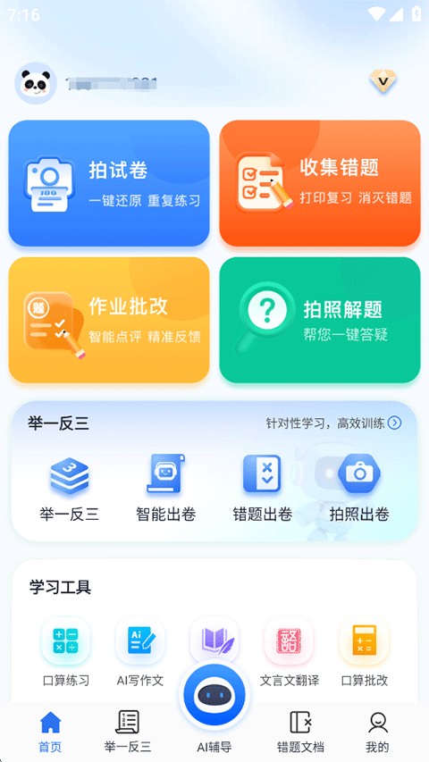 1、在本站下载安装试卷100app,在首页有拍试卷、收集错题、作业批改以及拍照解题等一众学习工具;