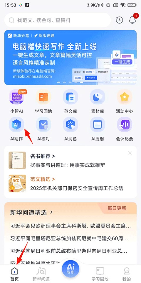 1、在本站下载安装新华妙笔app并打开,在首页点击AI写作功能;
