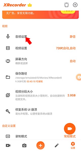 1、在本站下载安装xrecorder汉化版app并打开,点击右下角的设置选项