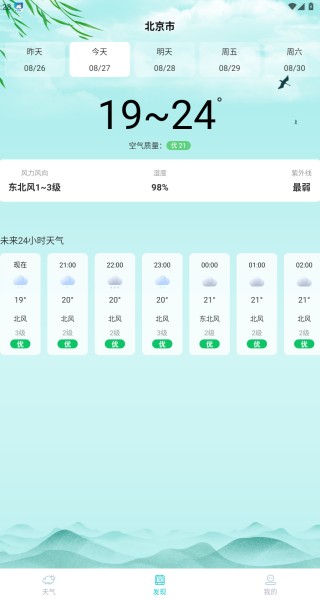 2、【逐小时天气预报】轻松查阅24小时内天气变化,提早预防早晚温差过大。