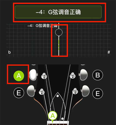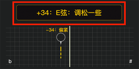 3、根据APP提示的"偏紧"(需要调松琴弦)"偏松"(需要调紧琴弦)来调整扭动吉他旋钮,每次扭动幅度不
