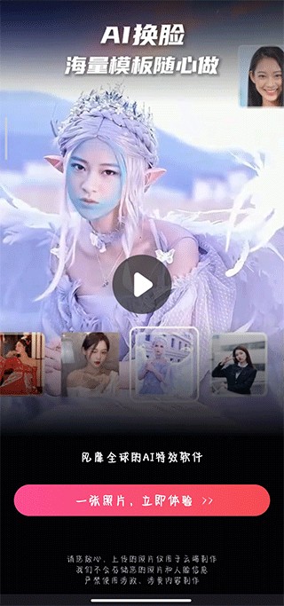 1、在本站下载安装超级百变秀换脸app并打开,点击立即体验,进入软件