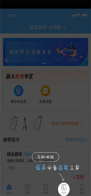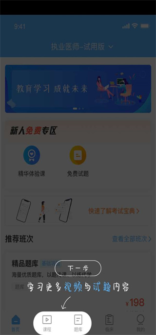 3、进入软件后,在新人免费区有精选题库和名师课程可以学习;