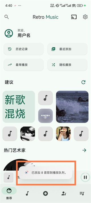 1、在本站下载安装RetroMusic音乐app并打开,点击界面上的图标就会添加歌曲到播放队列。