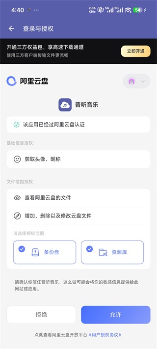 3、授权登录阿里云盘(授权成功将会创建普听音乐相关目录)