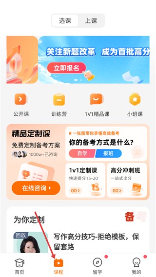 2、课程页面分选课、上课栏,有公开课、训练营等课程类型,提供精品定制课,可免费定制备考方案,也有写作高分技巧等定制内容。