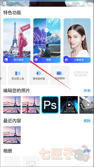 1、在本站下载安装PhotoRetouchp图修图app并打开,可以看到【照片擦除】、【修图】、【人像美容】等功能,选择【照片擦除】功能进入;
