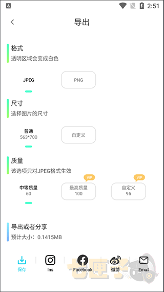 5、然后点击右上角的按钮即可对擦除后的照片进行保存,且可以自由选择保存的格式、尺寸、质量等等,也能直接进行分享;