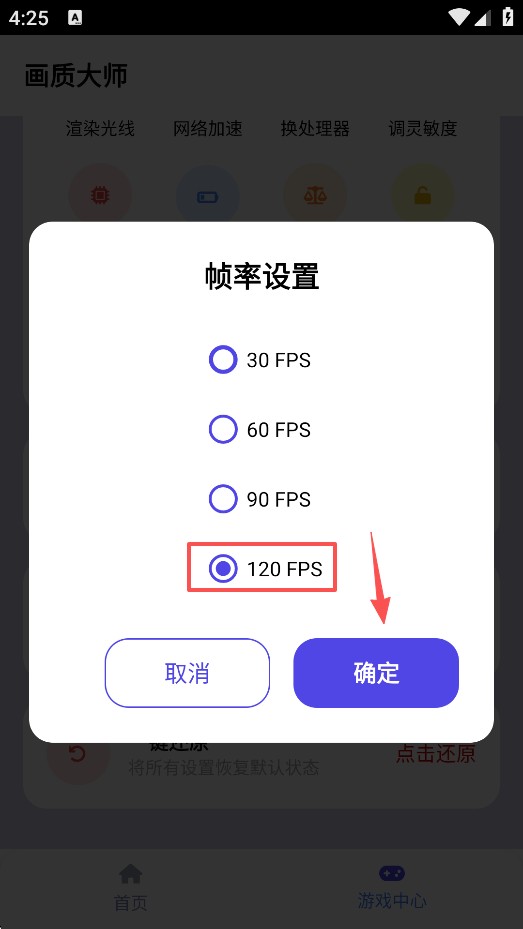 2、在打开的帧率设置页勾选【120FPS】,点击【确定】即可。