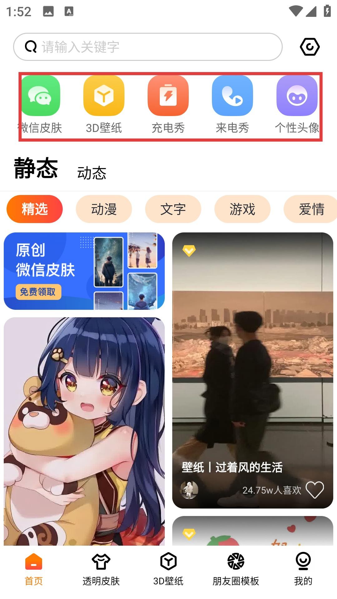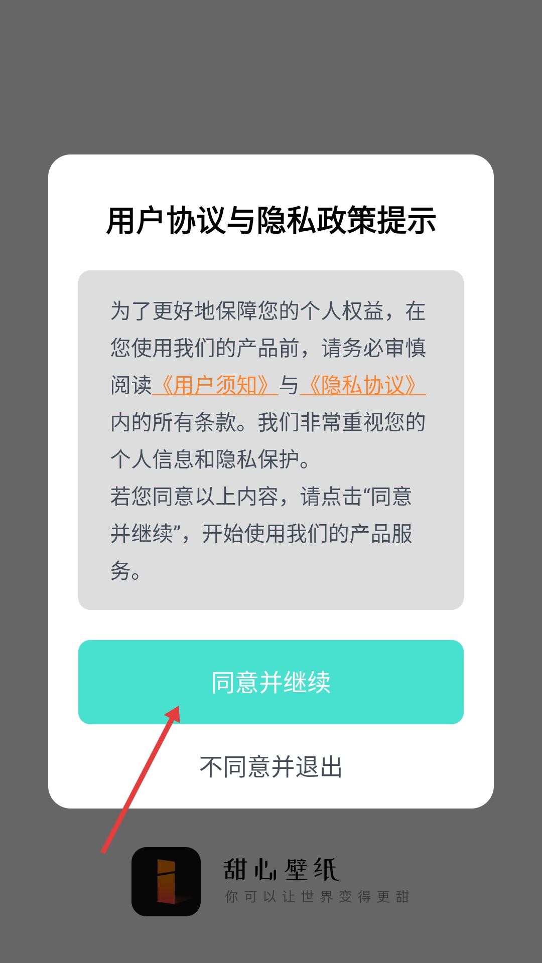 1、在本站下载安装甜心壁纸app并打开,点同意用户协议,进入首页,选微信皮肤等功能,浏览静态壁纸,更换手机桌面。