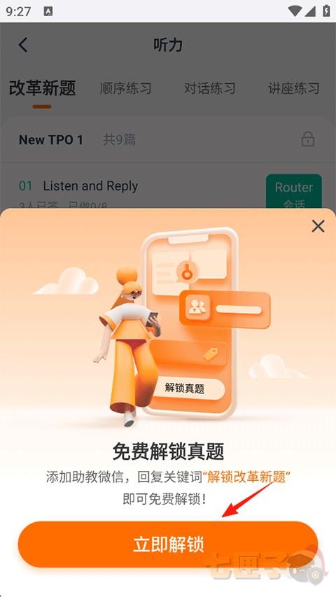 2、在听力模块下方选择需要练习的题型,如“改革新题”,点击右侧的解锁图标;