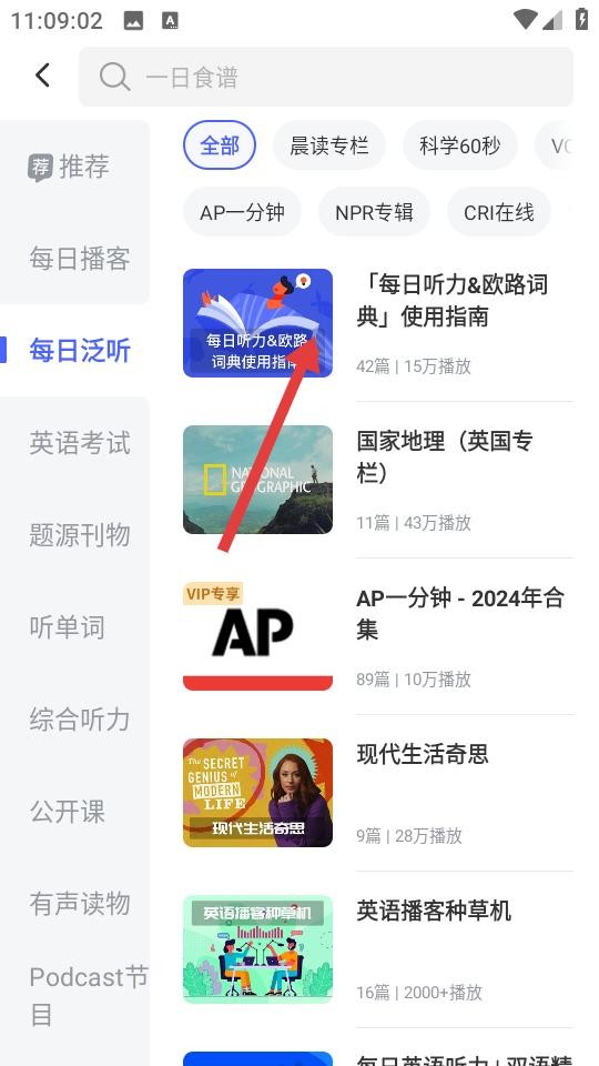 2、进入泛听板块查看每日听力欧路词典使用指南等内容,从功能讲解到学习技巧,不同播放量的课程适配多样需求,帮助用户深入挖掘软件功能。