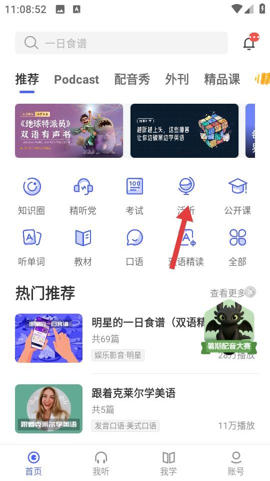 1、在本站下载安装每日英语听力学习版app并打开,在app首页切换推荐板块,点击泛听浏览双语有声书、热门播客等多元听力资源,覆盖娱乐、学习等主题。
