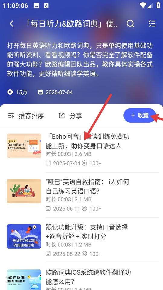 3、进入每日听力欧路词典使用指南页面浏览Echo回音跟读训练等功能介绍,点击收藏留存实用内容,口语达人指南到跟读功能升级。