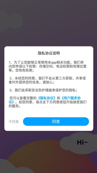 1、在本站下载安装云播报天气app并打开,进入隐私协议说明界面,直接点同意。