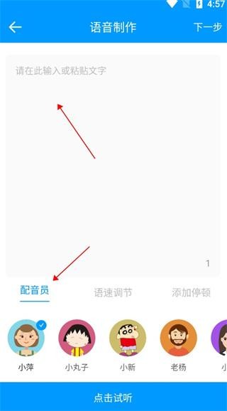 2、进入语音制作页面,将准备好的文字粘贴,选择配音员进行试听,点击下一步