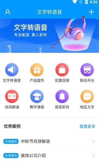 1、在本站下载安装文字转语音大师app,打开软件,点击首页右上角+号