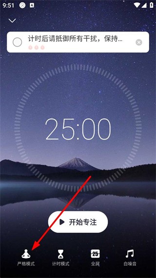 1、在本站下载安装专注清单app,打开进入专注计时主界面,显示计时时长,底部有严格模式等功能选项,点击严格模式,即可进入对应的模式设置操作界面。