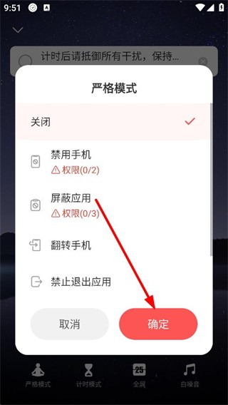 2、进入严格模式设置界面,可选择禁用手机、屏蔽应用等功能选项,完成功能选择后,点击确定按钮,即可完成严格模式的配置。