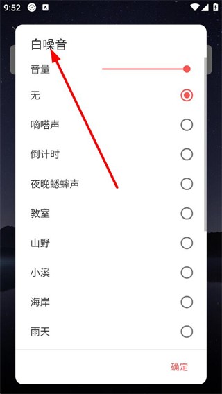 4、进入白噪音设置界面,可选择嘀嗒声、蟋蟀声等音效,还能调整音量,选好后点击确定,为专注计时添加对应的背景音效。