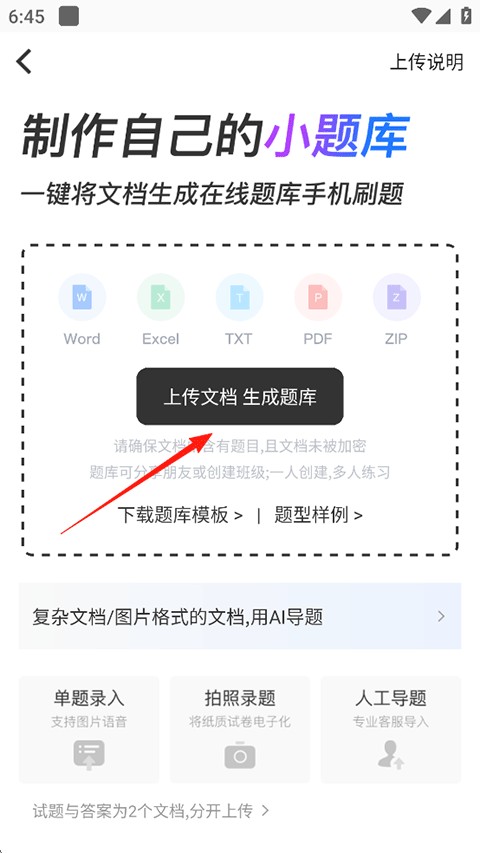 2、再次点击上传文档生成题库,从本地导入题库文档到刷刷题APP;